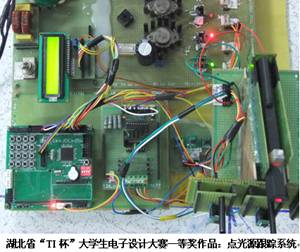作品介绍:本作品以TI的MSO430F449单片机为核心,设计并制作一个能够检测并指示点光源位置的光源跟踪系统。该系统通过使用三个光敏器件,经放大后,由A/D转换器处理,再将处理后的数据两两比较,从而检测出光照强度最大的那个光敏器件,即可判断光源位置。在点光源(单只1W白光LED)处,利用功率晶体管TIP41A驱动LED,可使点光源的电流能够在一定范围内调节。通过单片机控制,由步进电机带动激光笔转动,使激光笔能连续跟踪指向LED点光源。 |
