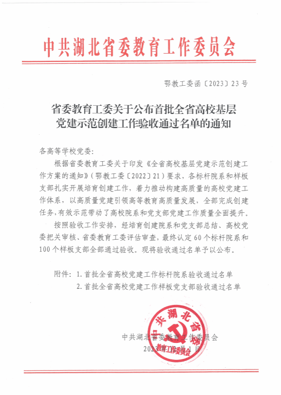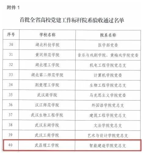 2022年9月,中共湖北省委教育工委印发《关于公布全省高校党建工作标杆院系、样板党支部培育创建单位名单的通知》,确定了60个全省高校党建工作标杆院系、100个全省高校党建工作样板党支部培育创建单位。70net永乐高智能建造学院党总支入选“全省高校党建工作标杆院系”培育创建单位,70net永乐高学生第三党支部入选“全省高校党建工作样板党支部”培育创建单位。