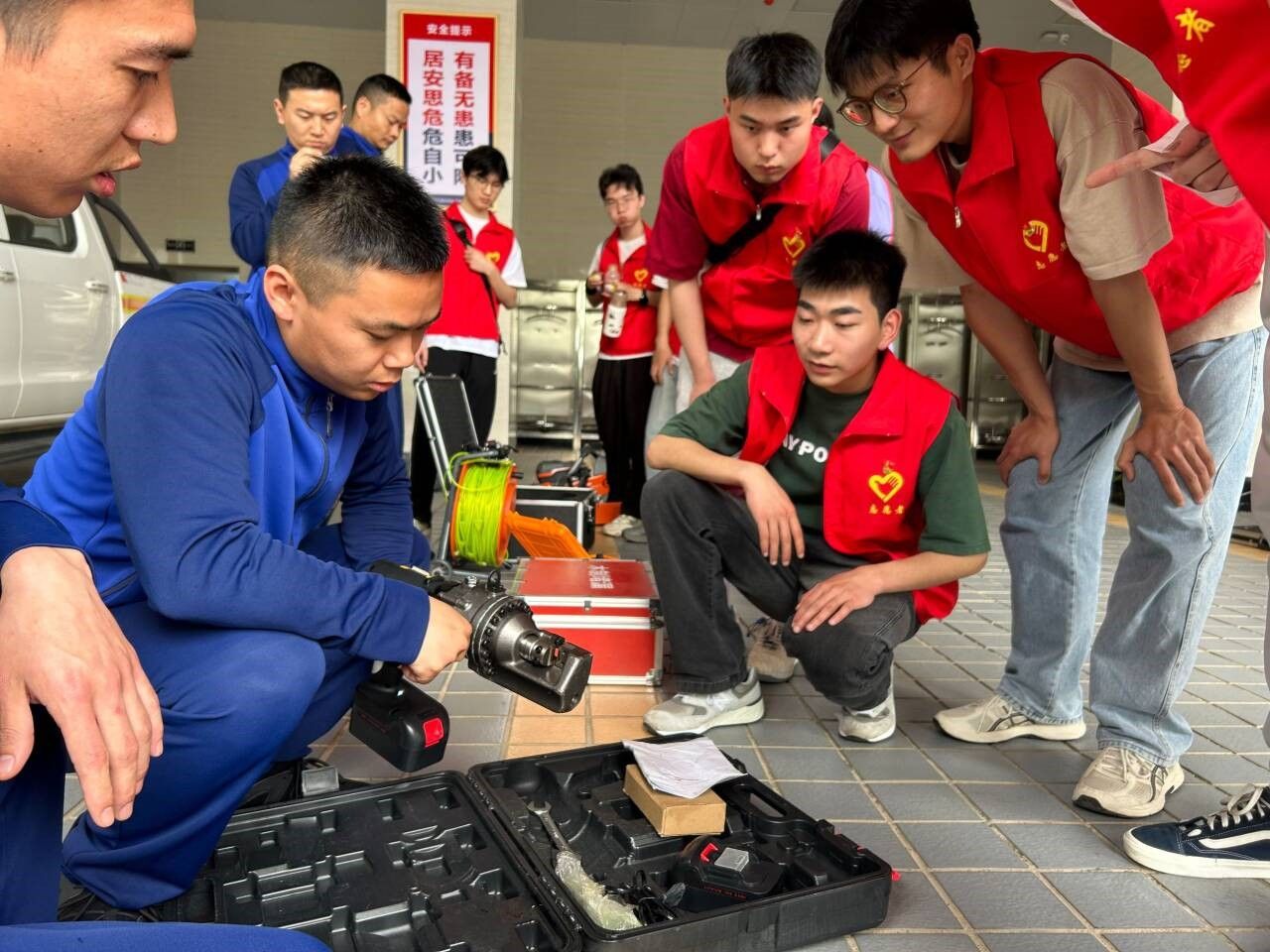 活动开始,消防员为学员们展示了各式消防工具,以及适用于不同环境的消防服和消防车。消防员们在现场为同学们展示了消防工具的使用方法,在讲解过程中学员们认真聆听,并积极向消防员提出了自己的想法,消防员们一一进行详细解答。此外,消防员们还介绍了各种工具,并为学员们演示了部分工具的使用方式,让学员们熟悉了这些工具的用法。
