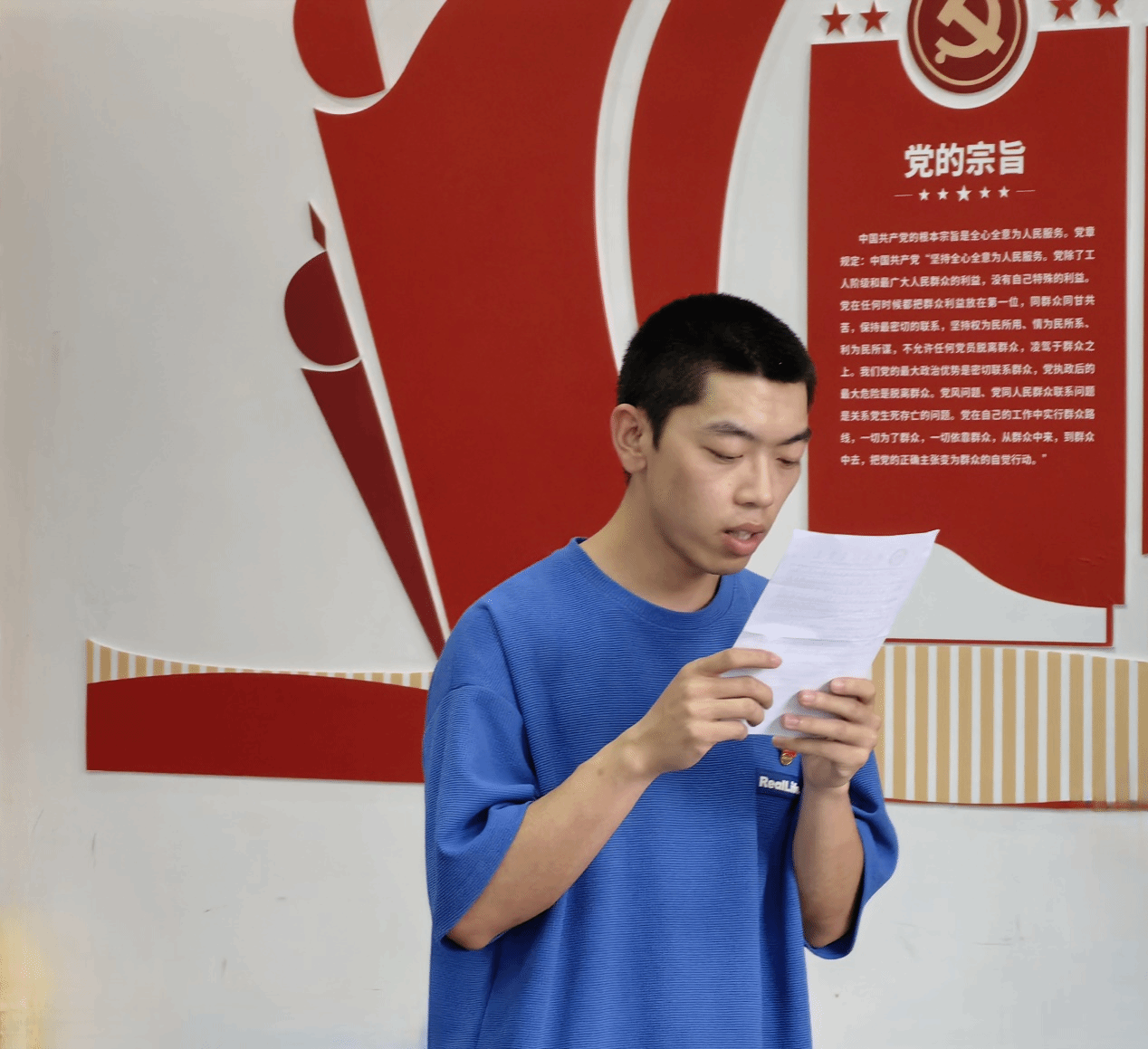 会议伊始,支部副书记陈鑫同志强调会议纪律和本次会议的主要内容,会议严格按照党组织接收预备党员程序进行:第一项由预备党员宣读自己的《转正申请书》;第二项支部内民主讨论,由党内同志发表意见;第三项由在场的正式党员以无记名投票的方式进行表决,赞成人数超过应到会且有表决权的正式党员的半数,方能通过接收预备党员的决议;第四项,党支部副书记陈鑫同志宣读支部大会决议;第五项,转正对象进行一句话表态,表明自己对大家今后的决心;第六项,由支部副书记陈鑫同志带领全体同志进行入党誓词。