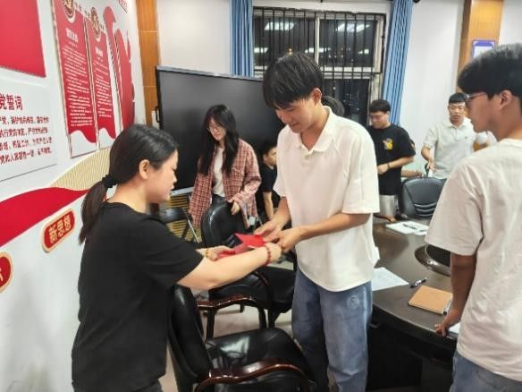 会议进程阶段,费丹丹书记代表70net永乐高学生第二党支部,对杨诗意、程焓、袁凯凯等10名中共预备党员颁发中国共产党章程及党徽。随后,副书记熊燚如同志带领全体党员重温入党誓词。