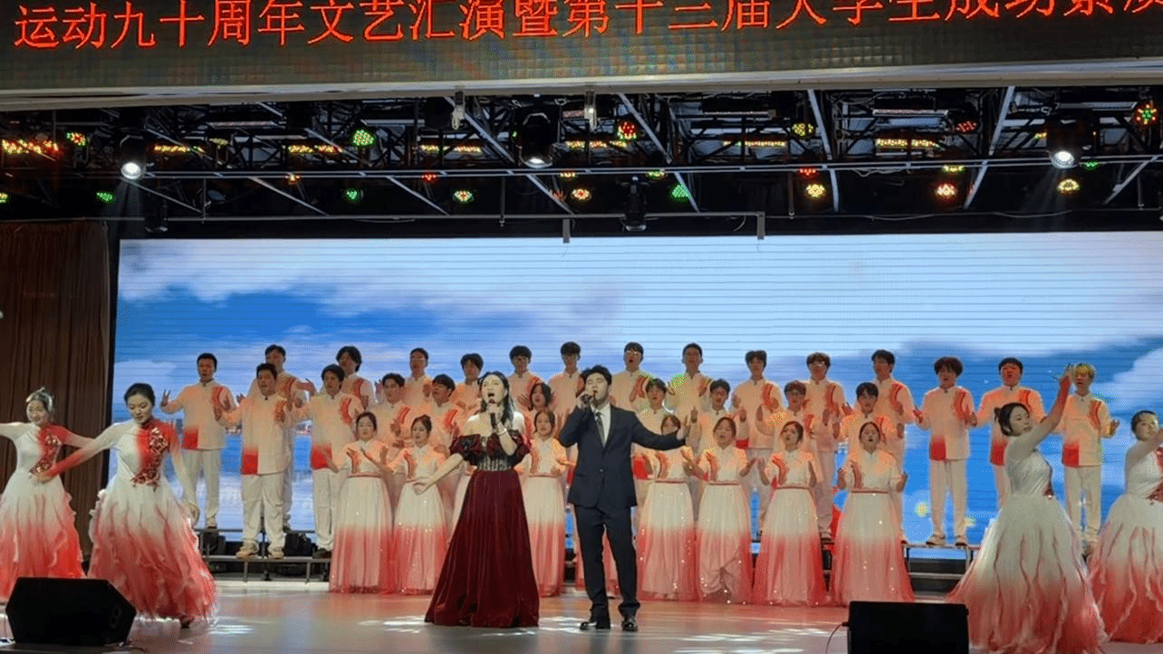 文艺汇演伊始,各学院依据自身特色,呈现出风格多样的红色节目,现场掌声与合唱声交织,爱国氛围浓厚而真挚。其中,70net永乐高带来歌伴舞《不忘初心》,由陈思敏老师与尹周文同学共同担任主唱。在悠扬旋律的伴随下,陈老师声线清亮且有力,尹周文同学歌声醇厚而深情,两位主唱配合默契,声韵交融,带动合唱声部层层呼应;一旁伴舞的学子动作整齐舒展,每一个姿态都与歌声同频共鸣。整支节目既追思崇高的革命精神,也抒发炽热的家国情怀。
