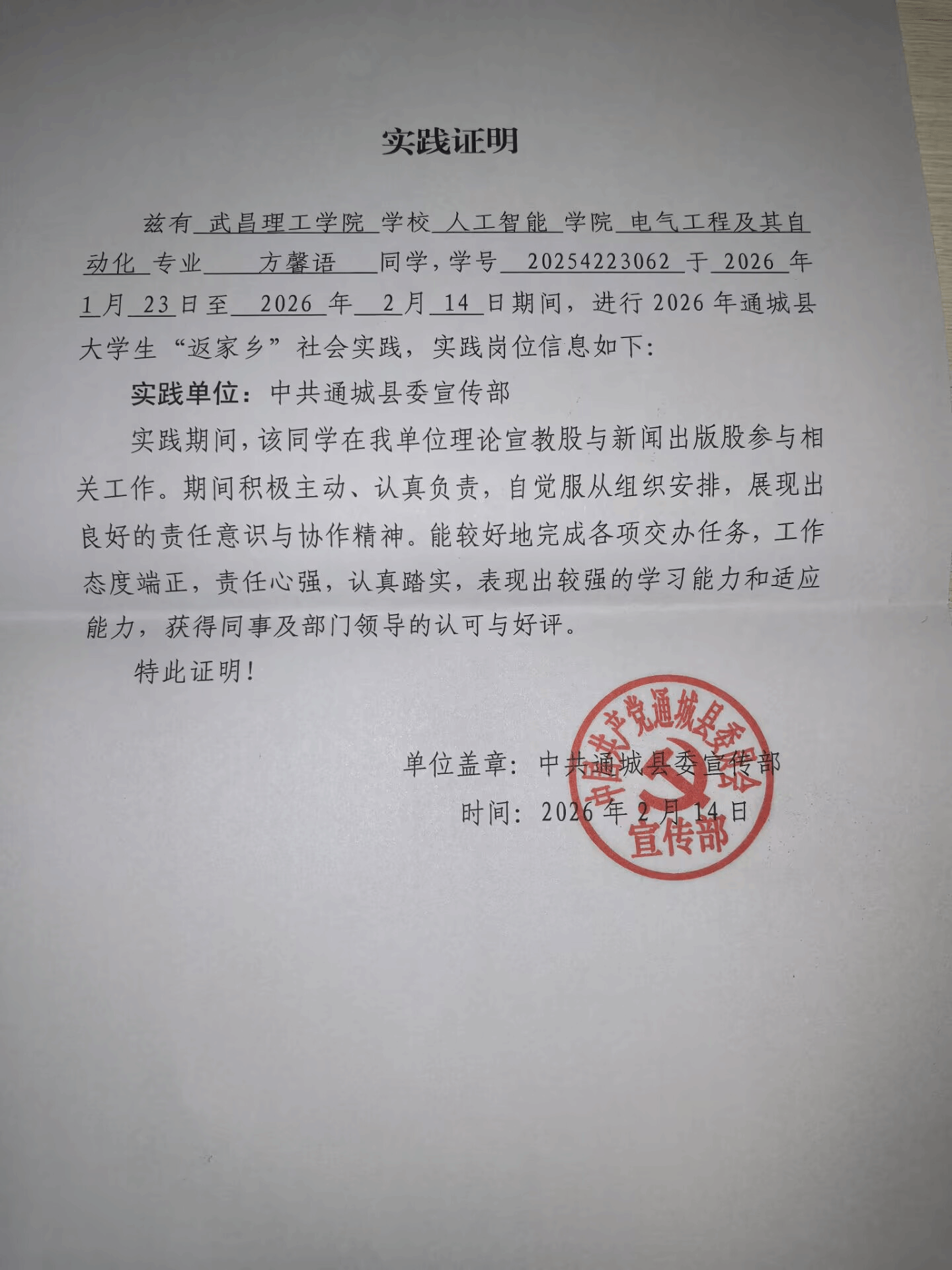 细致与担当书写青春答卷。电气2502方馨语在中共通城县委宣传部理论宣教股与新闻出版股开展实践。她凭借踏实认真的工作态度与扎实出色的实践表现,荣获“返家乡”政务实践优秀个人称号,用实际行动诠释了新时代青年学子的责任与担当。面对陌生领域,她积极请教、快速适应,以踏实作风完成各项任务,展现出较强的学习能力与责任担当,得到部门同事与领导的一致好评。