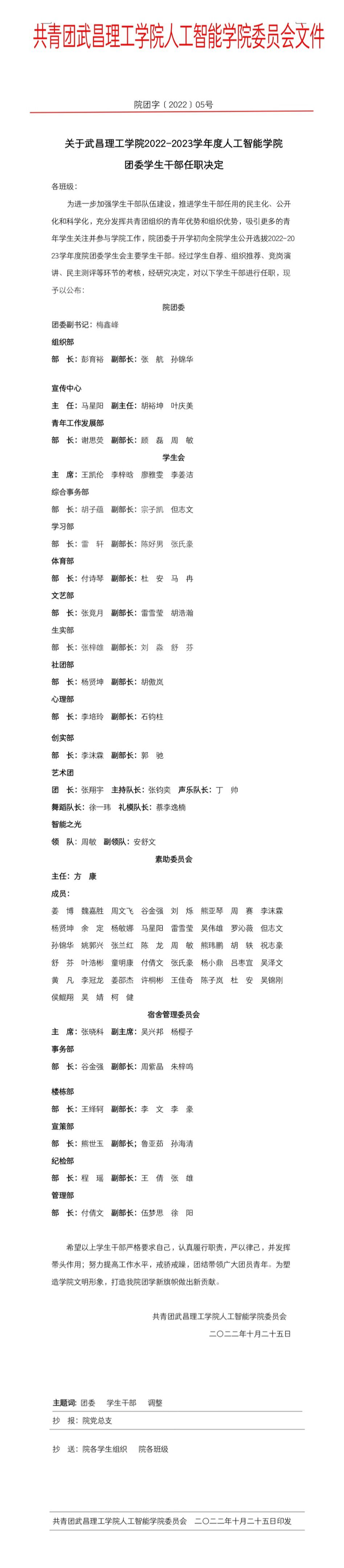 2022-2023学年度70net永乐高团委学生干部任职决定