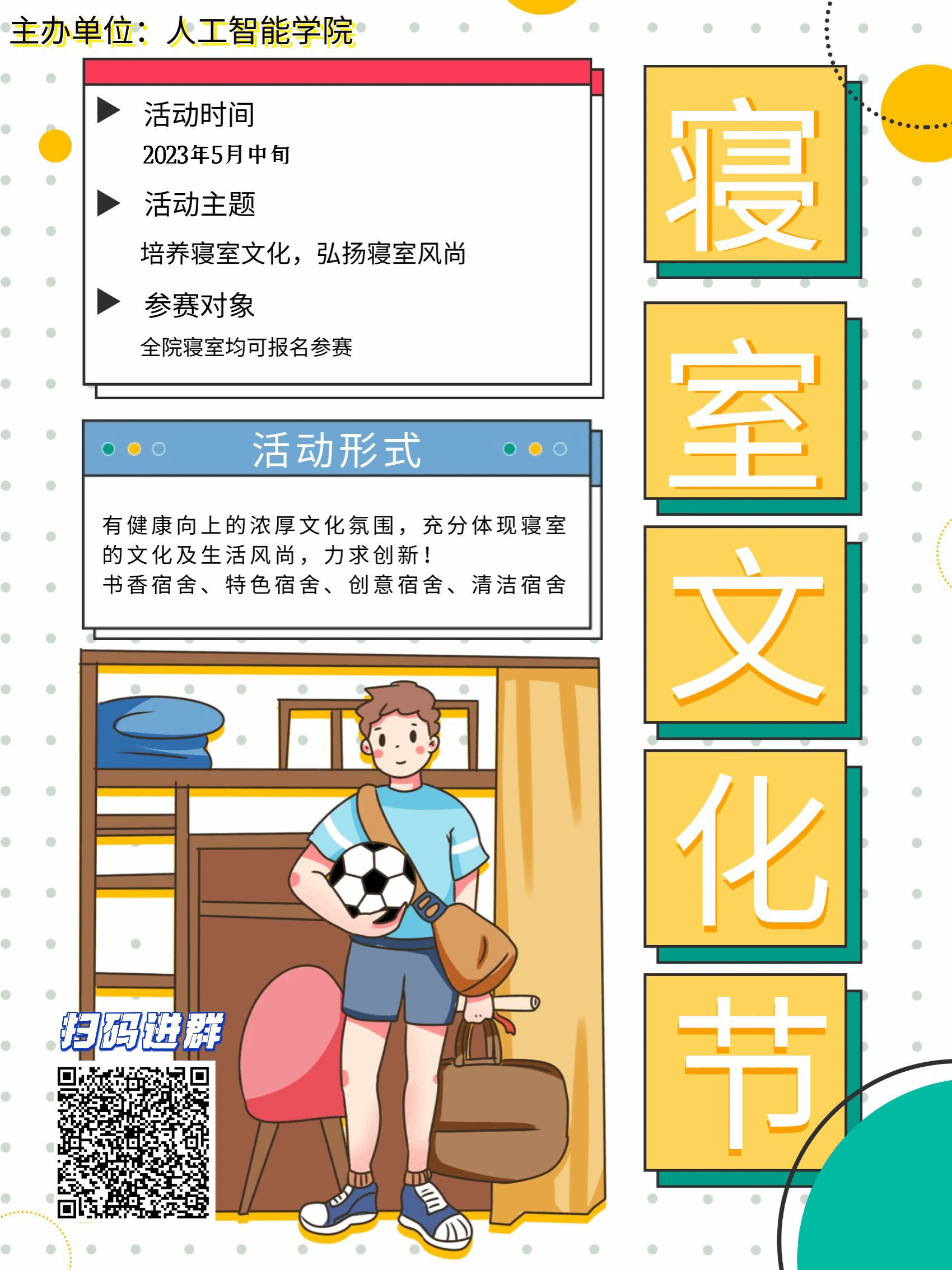 寝室文化节期间,我们将提供充足的支持和资源,帮助同学们实现他们的创意与梦想。不仅仅是一场寝室文化的展示,更是一个展现个人才华、锻炼团队合作能力的机会。