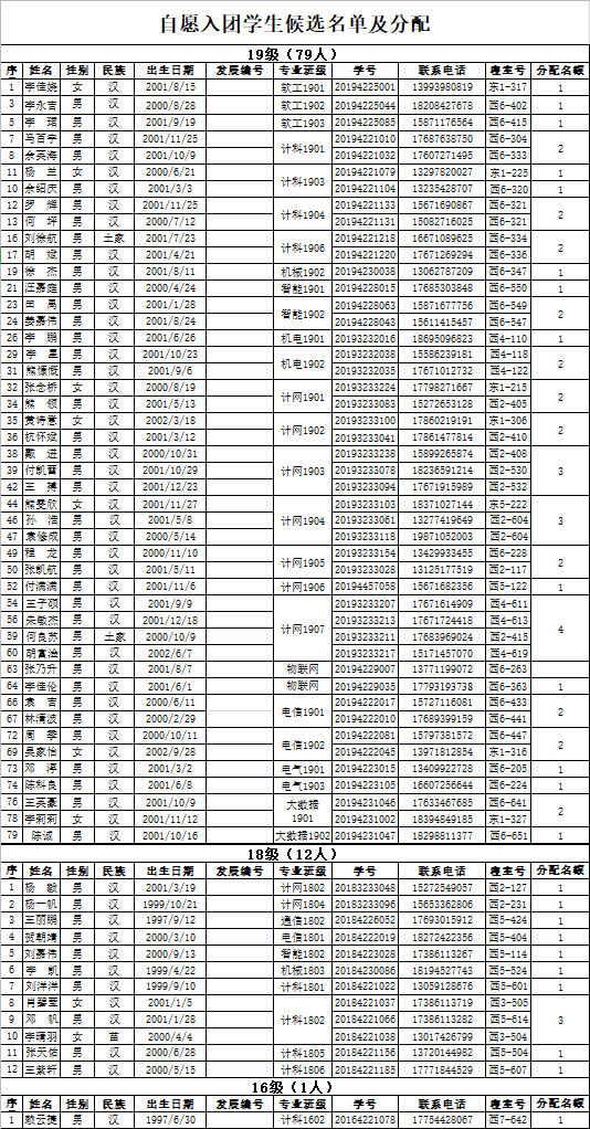 根据2020年《关于推荐优秀学生入团工作的通知》,目前我们已将各班推荐的优秀学生名单统计,现将预备入团学生名单公布。本次预备入团学生选举根据在班级QQ群发起群投票,有效票数超过班级总人数2/3,以截图为证确定班级投票人选;班里有优秀的少数民族候选人,可优先推荐;如果参选同学有特殊情况,可向组织部上报情况说明,团委会根据相关情况酌情处理,重新调配名额。
