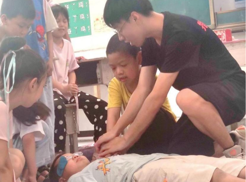 2022年暑期,在湖北红安县列宁小学的教室里,一群三年级的学生正坐在教室里聚精会神的看着黑板。团队志愿者正在为大家讲述溺水自救等相关知识,并亲自示范。支教期间,列宁小学的孩子们与“智能之光”的志愿者们建立了深厚的师生与伙伴关系。
