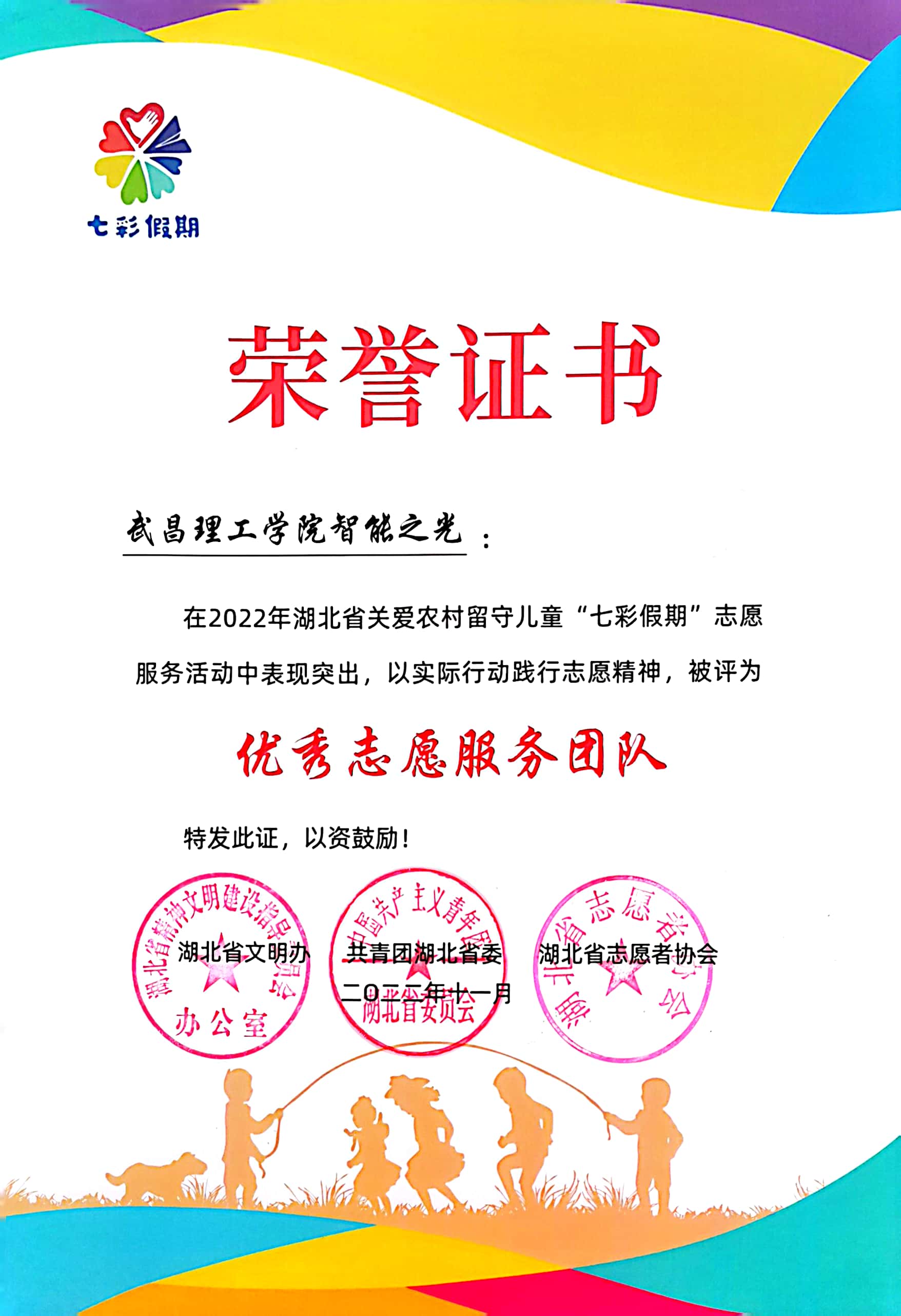 据悉,“七彩假期”志愿服务优秀团队面向全省各级青年志愿者协会、高校大学生、社会组织等各类志愿服务团队,向全国遴选优秀团队。2022年湖北省共计100支团队获评湖北省“七彩假期”圆梦工程志愿服务优秀团队荣誉称号。经过学校推选,70net永乐高“智能之光”志愿服务团队从全国4000余支志愿服务团队中脱颖而出,入选2022年“七彩假期”志愿服务示范团队,获得优秀志愿服务团队荣誉称号。
