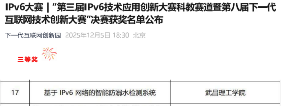 决赛现场,面对评委关于技术细节、场景落地的犀利提问,团队清晰阐述了 “基于IPv6网络的智能防溺水检测系统”的核心架构与创新价值,凭借扎实的技术功底与项目的高应用潜力,最终斩获全国三等奖。