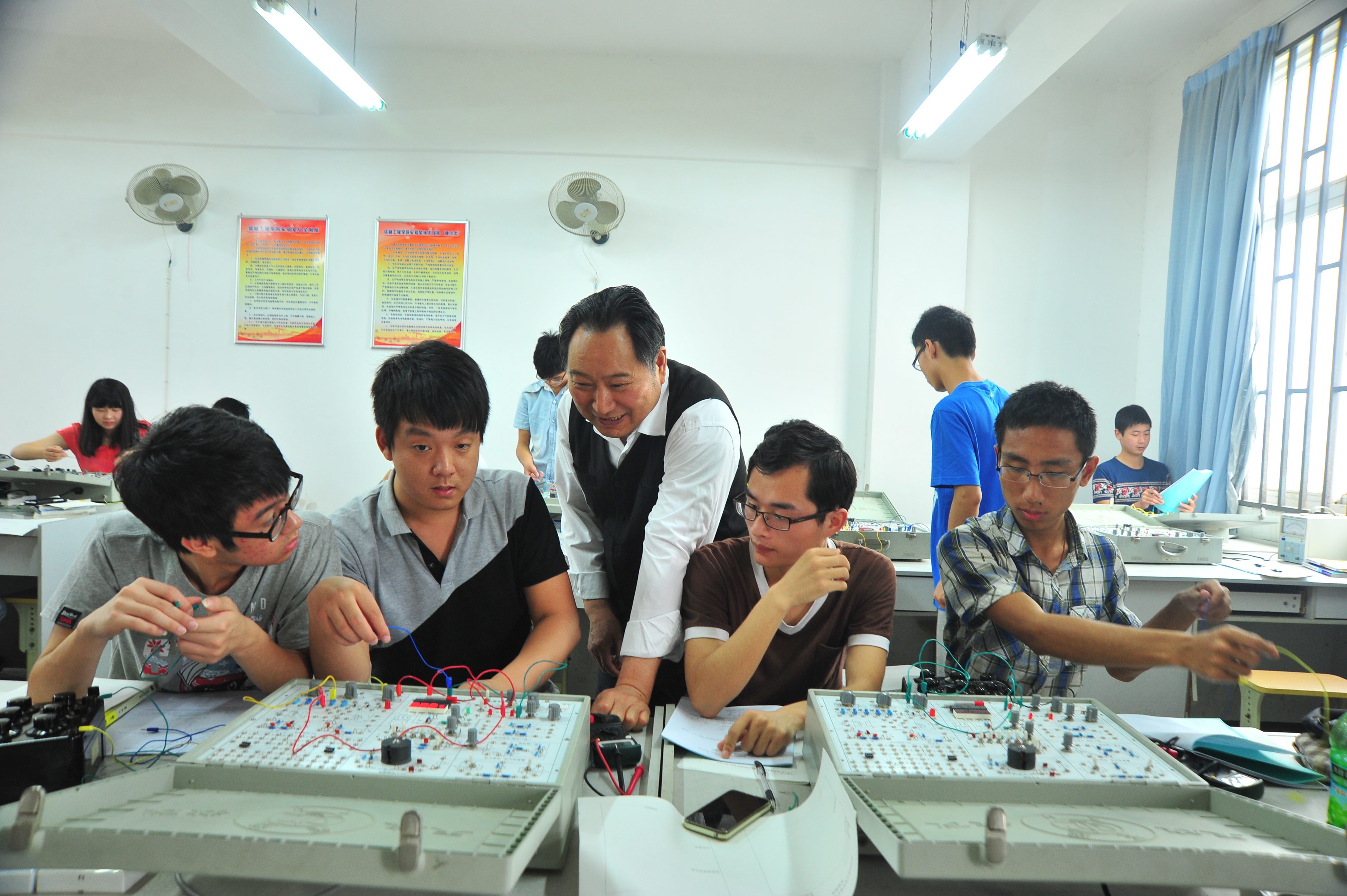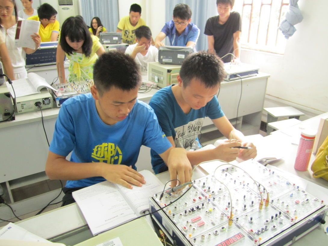 模拟电子实验室配置模拟电子技术实验箱30台、数字信号发生器25台、数字双踪示波器25套。主要面向电气工程及其自动化、通信工程、电子信息工程、计算机科学与技术、物联网工程、智能科学与技术、机电一体化技术等专业,配合《模拟电子技术实验》课程,开设相应实验内容。主要实验项目:单管交流放大电路、射极输出电路、差动放大电路、场效应管放大电路、负反馈放大电路、RC振荡电路、集成稳压电路、晶闸管可控整流电路、模拟运算电路、积分电路、微分电路、比较器、波形变换电路、集成功率放大电路等。