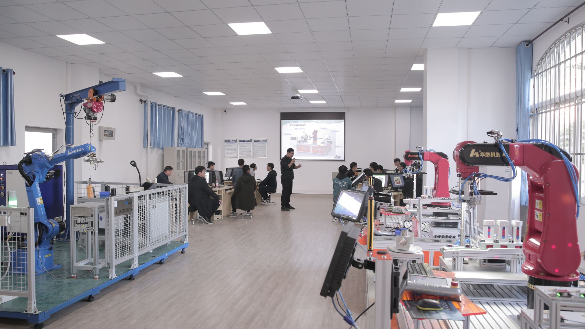 工业机器人实验室,配置机械拆装实训工作站1台、电气拆装实训工作站1台、综合实训平台2台、机械装调维修虚拟仿真实训与考评系统21节点、电气装调维修虚拟仿真实训与考评系统21节点、拆装与调试课程资源包GD-V3.0 1套、操调虚拟仿真实训与考评系统21节点和操作与编程课程资源包GD-V3.0 1套。主要面向电气工程及其自动化、机械电子工程、电子信息工程、智能科学与技术、计算机科学与技术等专业开设相应实验内容。主要实验项目:排油与线束拆除、拆小臂与J4轴、拆J3轴与电机座、工业机器人电气原理图识读、工业机器人电控系统调试等。