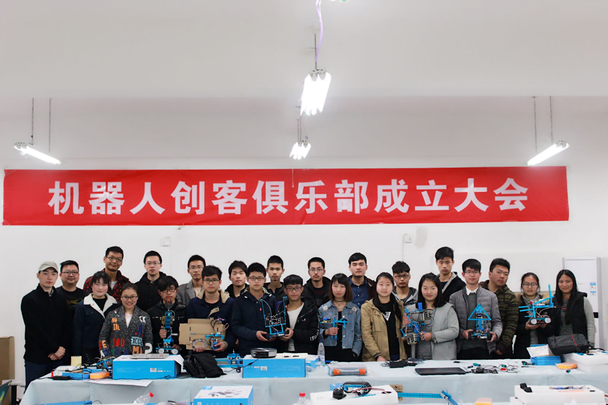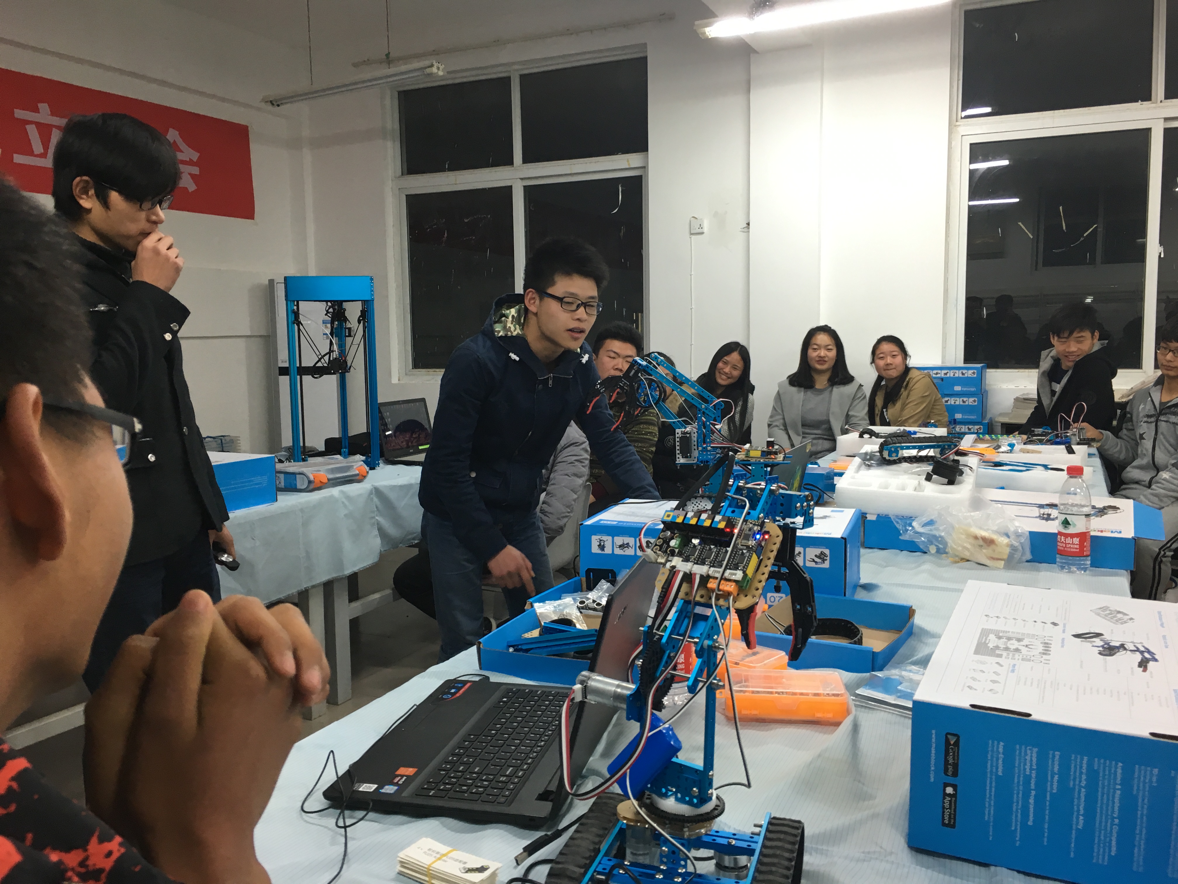 机器人创客实训室,配置高级教学机器人Ultimate2.0 20套、机器人结构件12套、机器人传动件13套、电子模块4套、电机模块4套、打印机套件2套、电脑1台等设备。面向全院所有专业,配合机器人创新实践,开设实验内容。主要实验项目:初级教学机器人mBot、中级教学机器人mBot Ranger、高级教学机器人Ultimate2.0、3D打印机的使用、创客套装使用、模拟创客马拉松等。